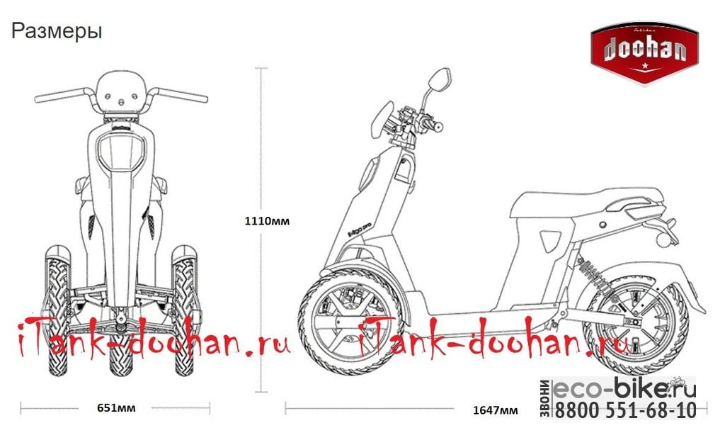 Размеры iTango Classic 1000W 164х65х111 см. расчитан на 2-х пассажиров, имеет максимально допустимую нагрузку в 130кг, при собственном весе 65кг.
