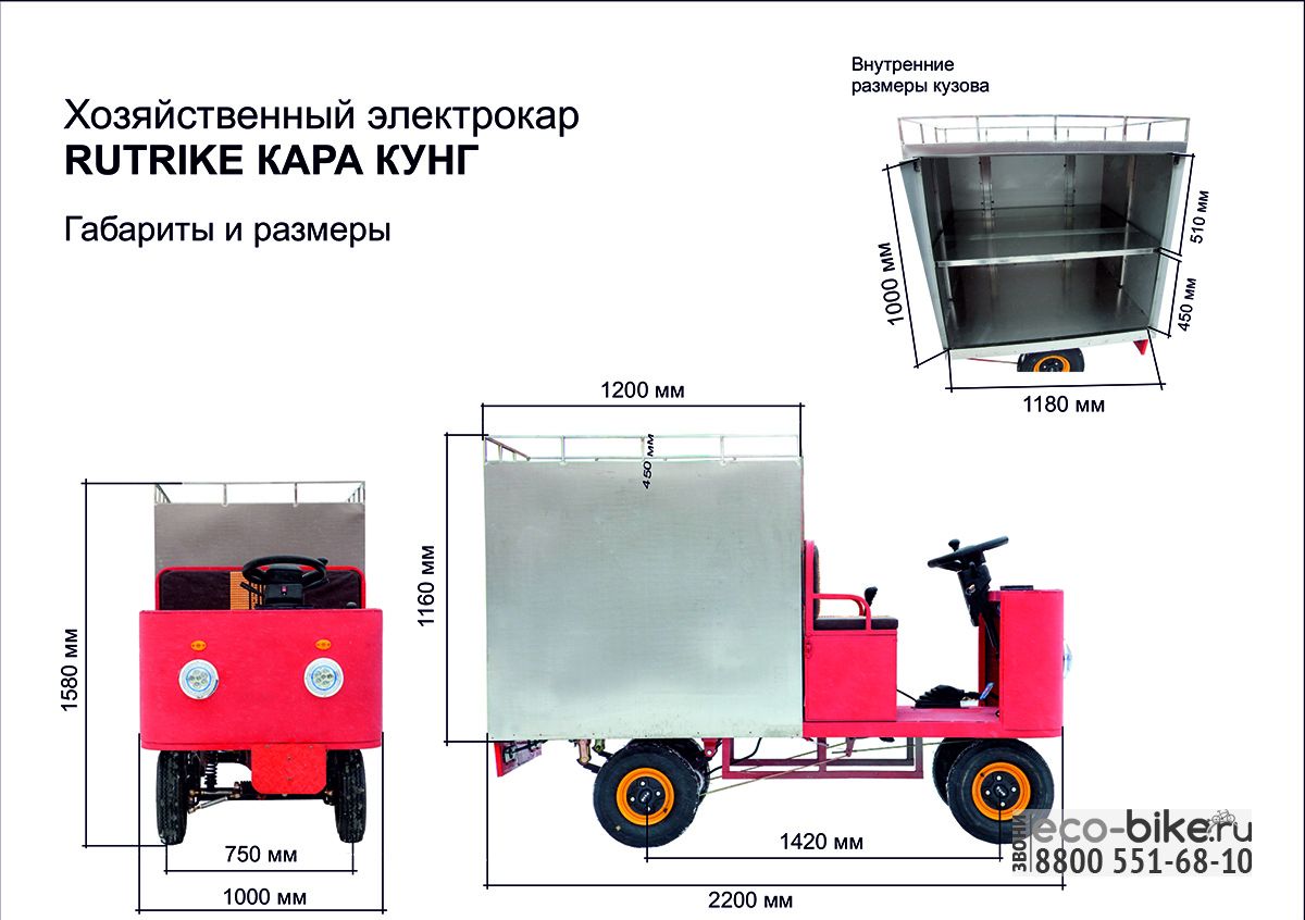 Rutrike Кара имеет сверхкомпактные габариты 2200х1000х1580 мм и кузов фургон с боковыми дверями и внутренней полкой.